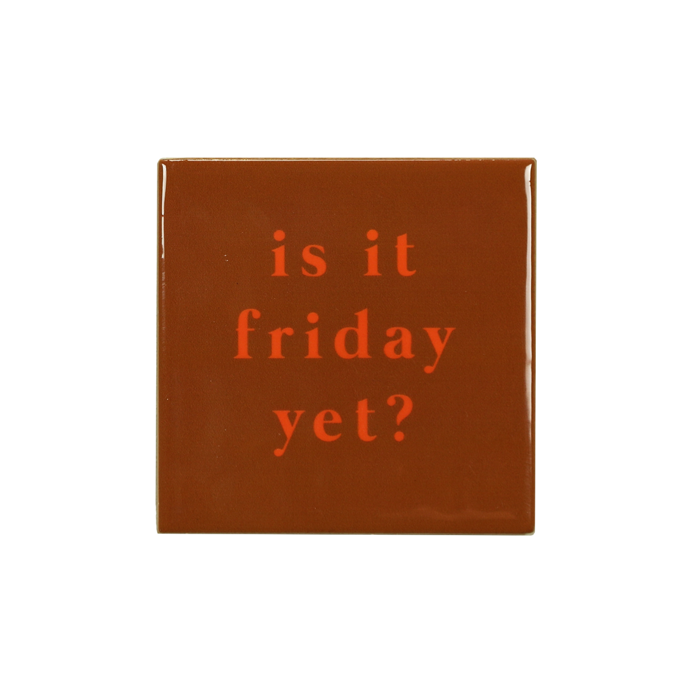Deze magnetische tegel met grappig quote ‘Is it friday yet?’ heeft een diepe bruine kleur en een glanzende glazuurlaag. Op elke formaat magneetbord of behang is er een plek voor deze tegel. Super leuk om te combineren met de roze tegel ‘partner in wine’. Verwerk de tegel in een leuke collage van grappige kaarten en foto’s voor een magneetwand die je direct vrolijk maakt!