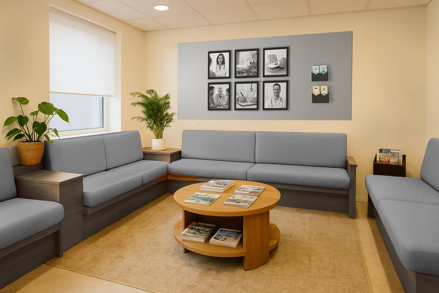 Maatwerk per afdeling: wachtkamer, balie, spreek-/behandelkamer, teamruimte.